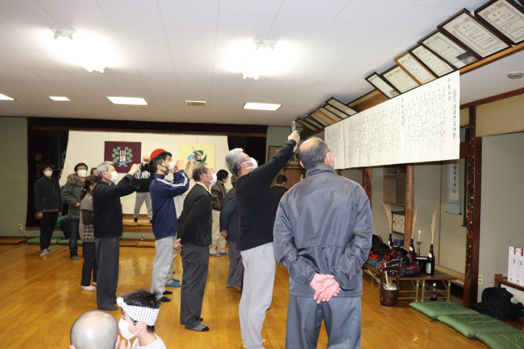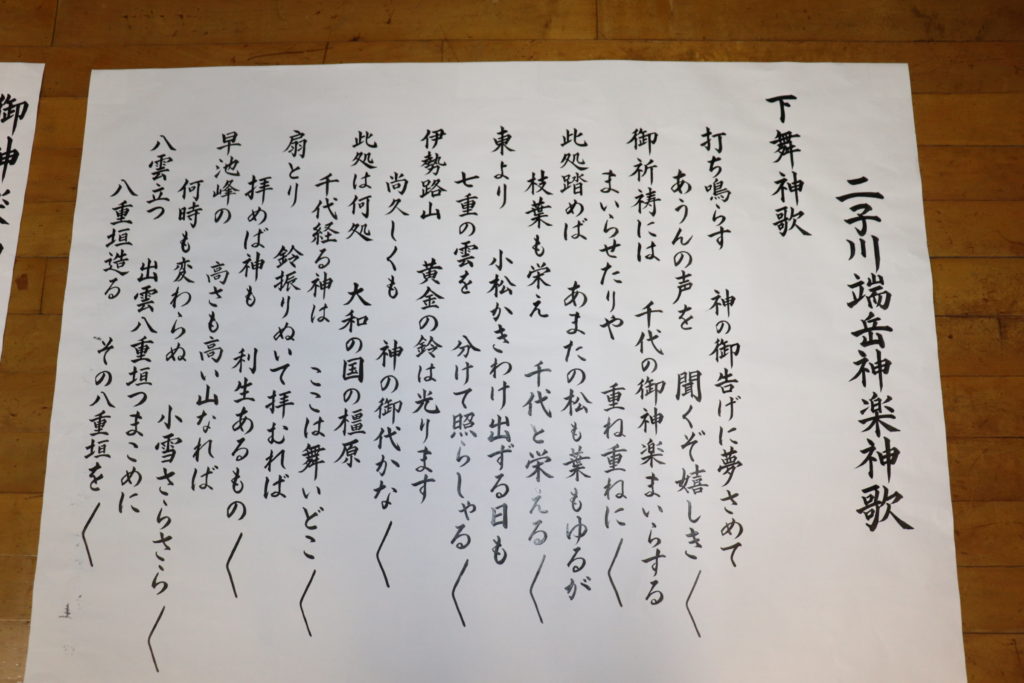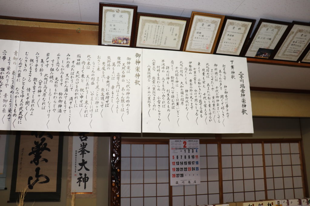 HOME > お知らせ > お知らせ 神歌が披露されました 投稿日:2023年2月19日 火防祭練習期間中に掲示される神歌が、新しくなりました。この神歌を書いてくださったのが、及川奈々葉さん(及川貴史さん長女)です。 火防祭練習初日(2月18日(土))に披露され、魂入れが行われました。今後何年にもわたってこの素晴らしい神歌が掲示されることになります。奈々葉さんありがとうございました。そしてお疲れさまでした。 -お知らせ